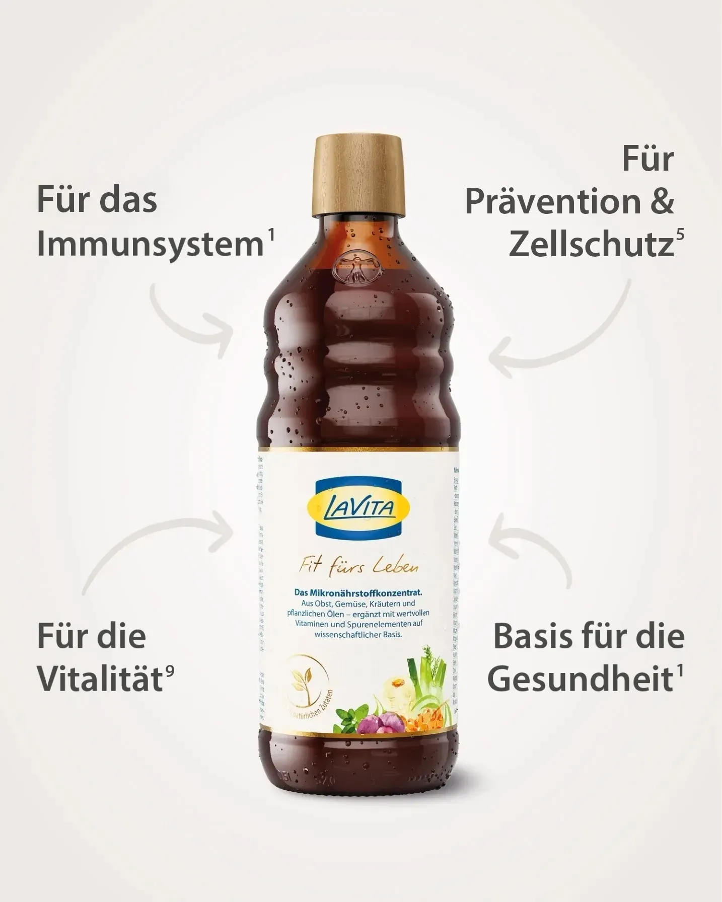 LaVita ist ein Mikronährstoffkonzentrat auf pflanzlicher Basis. LaVita enthält über 70 natürliche Lebensmittel wie buntes Gemüse, ausgereiftes Obst, Kräuter und pflanzliche Öle, ergänzt mit wertvollen Vitaminen und Spurenelementen. Mit LaVita können wir unsere tägliche Versorgung mit Vitaminen und Spurenelementen praktisch und ganzheitlich optimieren. LaVita vereint alle wichtigen Mikronährstoffe sowie Enzyme und unzählige sekundäre Pflanzenstoffe im natürlichen Gleichgewicht in einem Produkt.